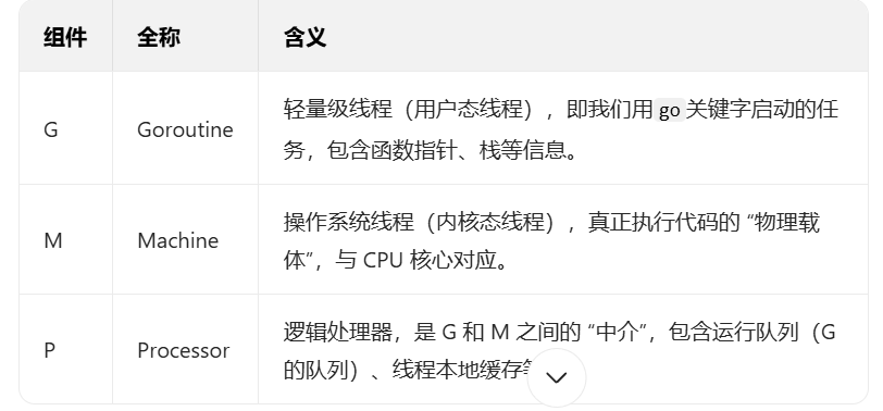 GMP 是 Go 语言实现 goroutine 调度的具体机制,是 Go 运行时(runtime)管理 goroutine 的核心,其中 G、M、P 分别代表三种关键组件: