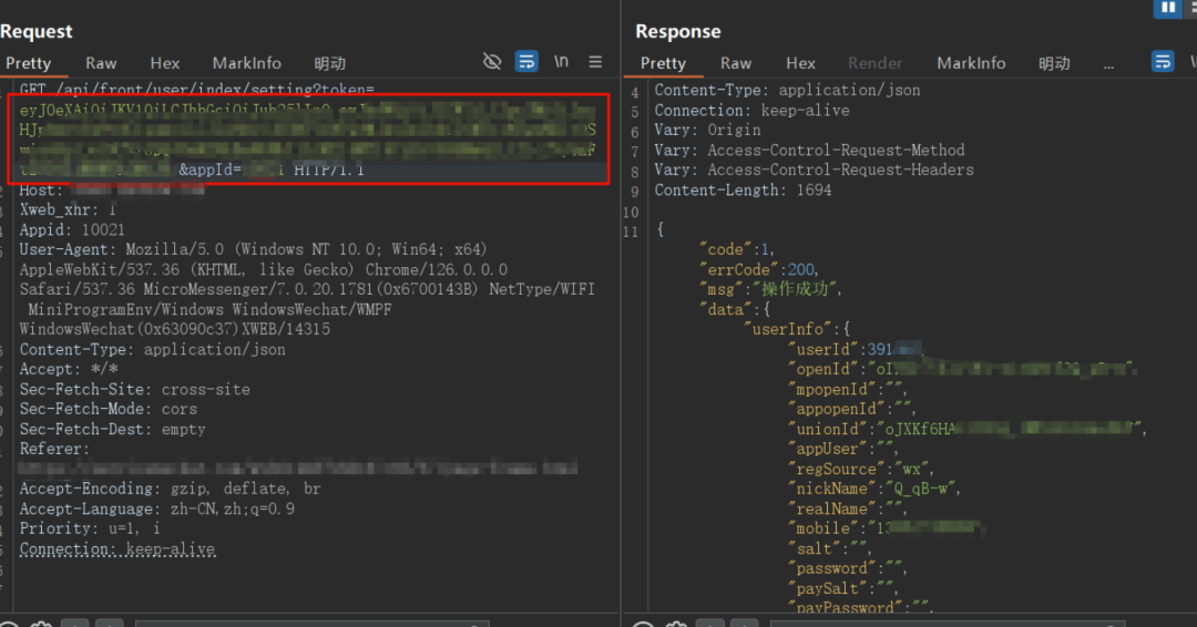 登录一波小程序,接着查看下个人信息,看有无id参数越权查询。