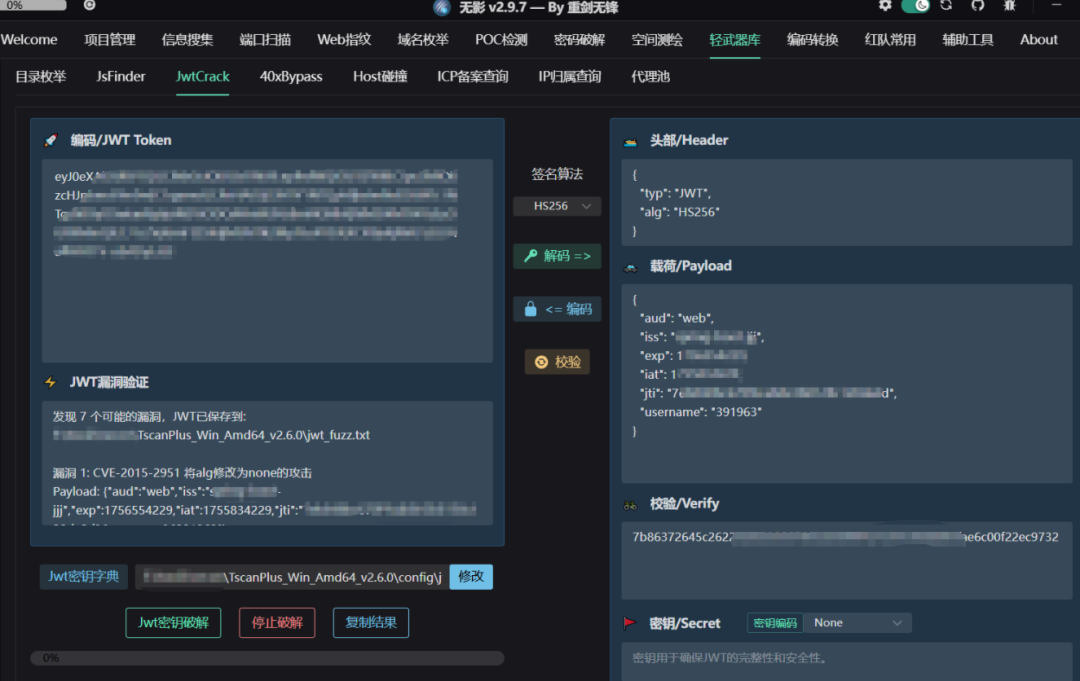 还有其他JWT漏扫工具,但是还是比较推荐无影Tscanplus: