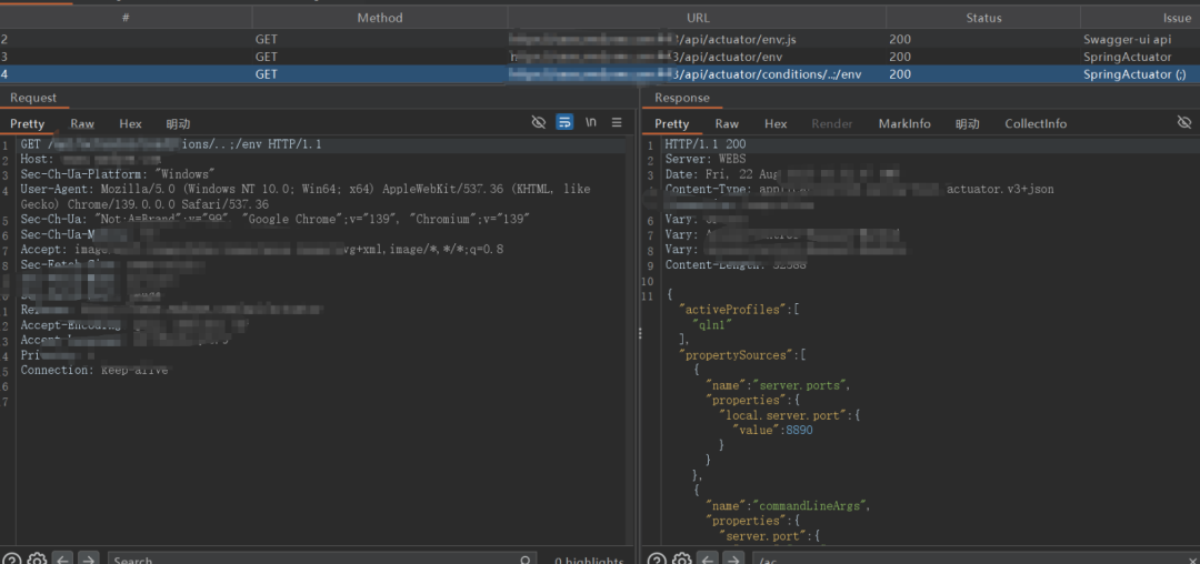 插件还捡了个Actuator端点泄露,其中泄露了ENV和Heapdump等高危端点。