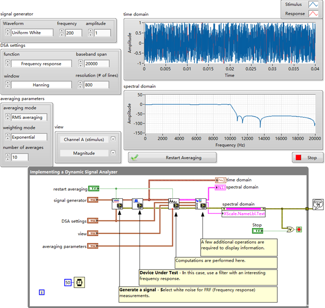LabVIEW动态信号分析仪(DSA)完成,经过生成信号、经被测设备(如特殊频率响应滤波器),利用 LabVIEW 进行计算与显示,可在时域、频域分析信号,支持多种测量机制与参数配置。