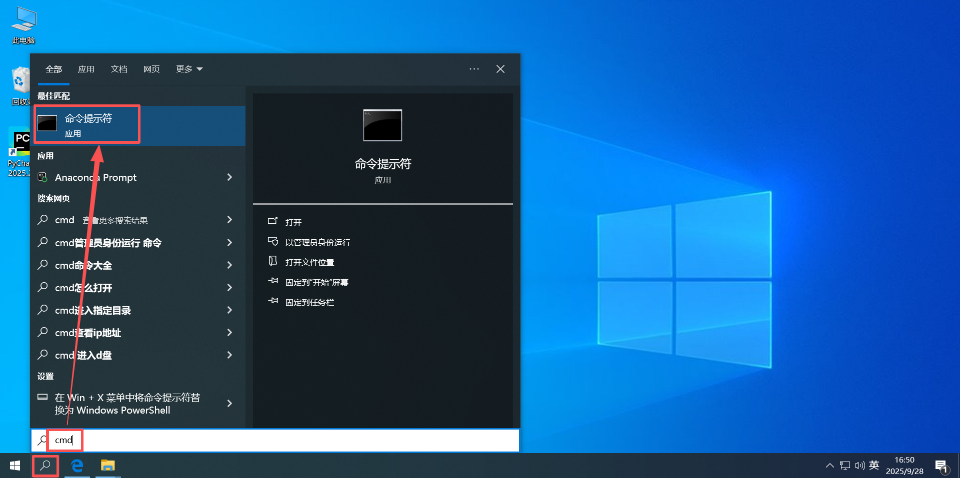 1)在搜索菜单中搜索“cmd”,找到命令提示符并点击,如下: