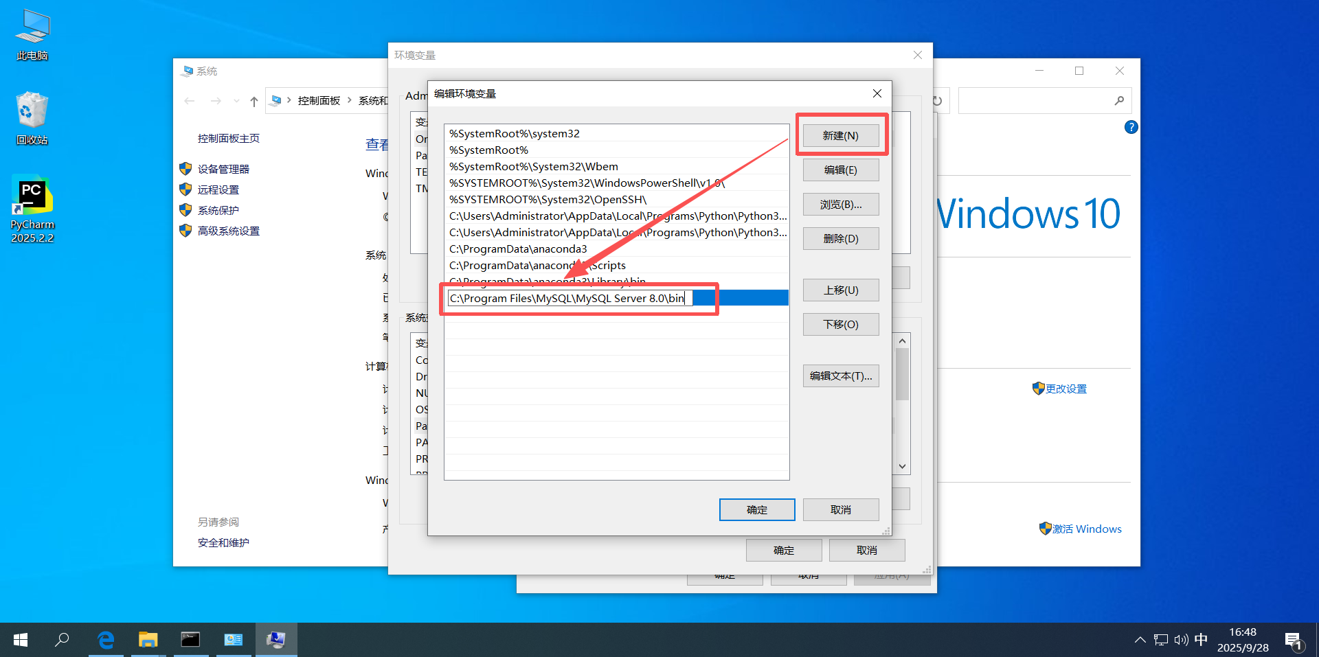 3) 复制路径“C:\Program Files\MySQL\MySQL Server 8.0\bin”,在弹出的页面中,点击“新建”,将所复制的路径粘贴到红框鼠标光标闪烁的地方,然后点击“确定”使设置生效。