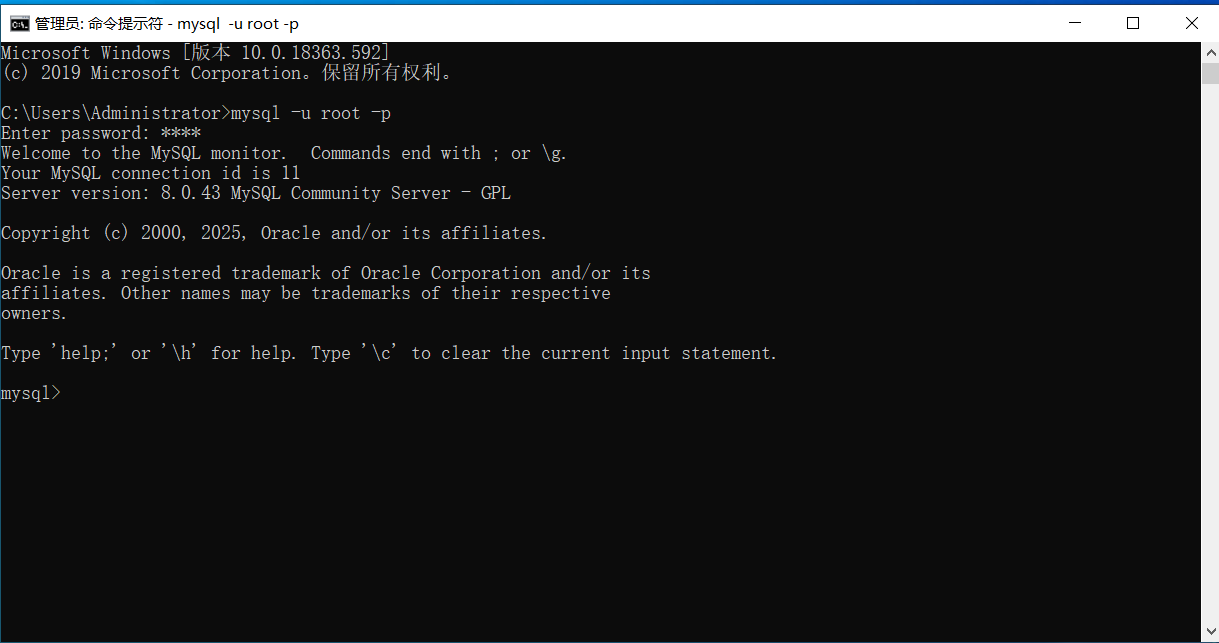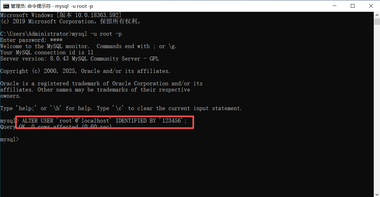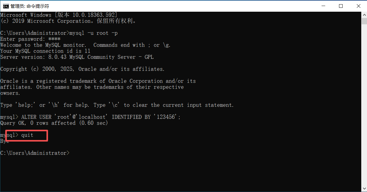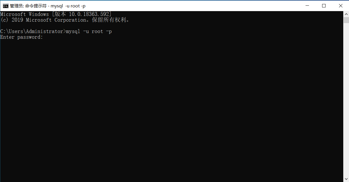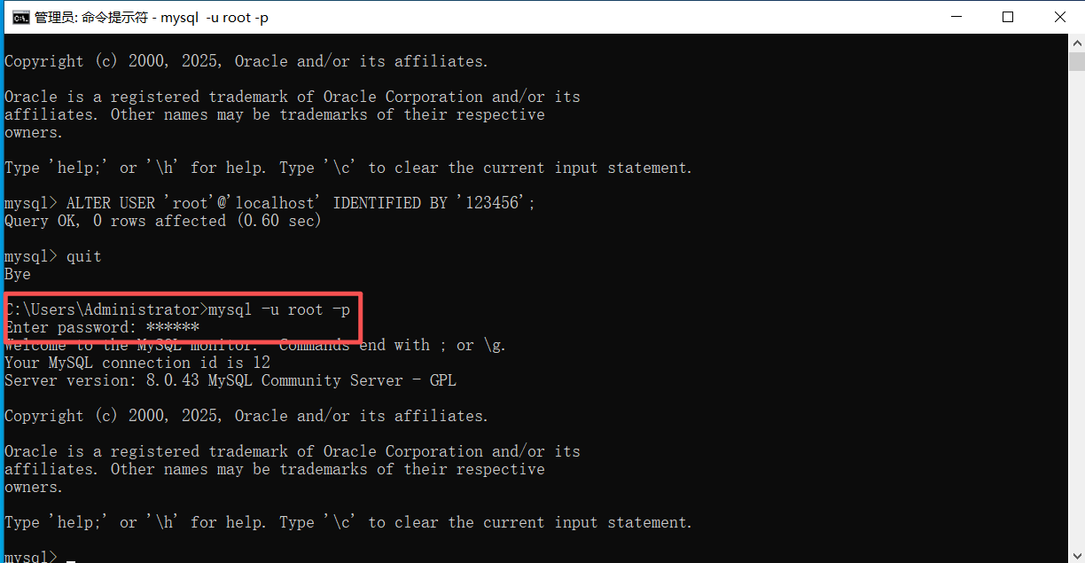 d. 重新执行“mysql -u root -p”命令,使用新密码“123456”,如下登录成功代表密码修改成功。