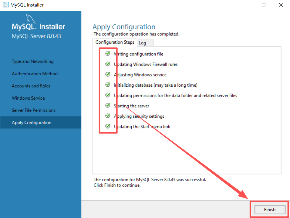 11)确保每一项配置前面都有绿色对钩√(如果有红色的X代表配置失败,具体解决办法见常见问题1),代表配置完成,点击“Finish”即可。