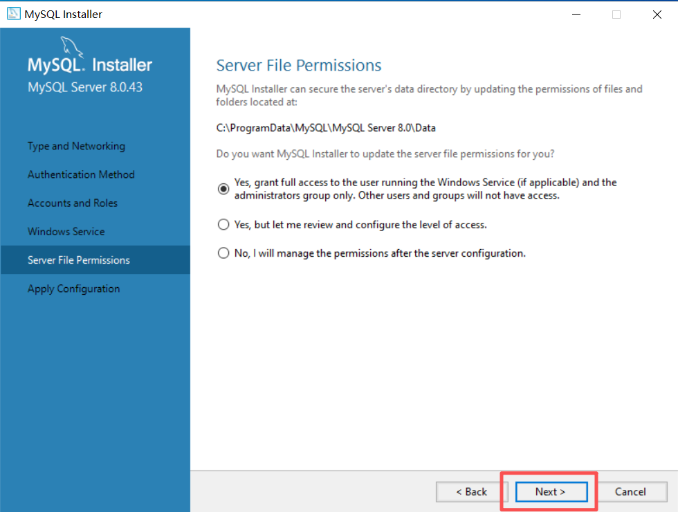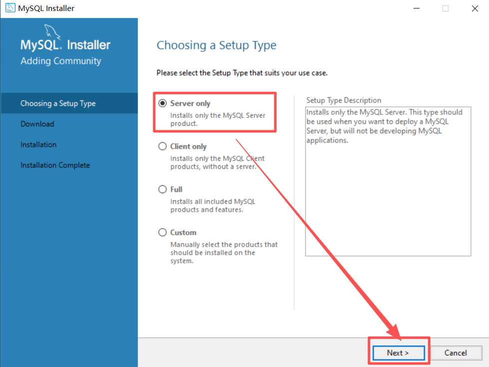 1)双击“mysql-installer-community-8.0.43.0.msi”,在弹出的页面中选择“Server only”,点击“Next”。