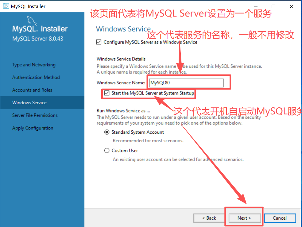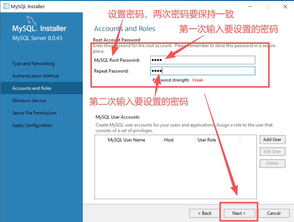 7)在弹出的页面配置MySQL的密码,如“root”(这里设置的密码必须找个小本本记录下来,后面在使用数据库的时候都要使用),配置完成后点击“Next”。
