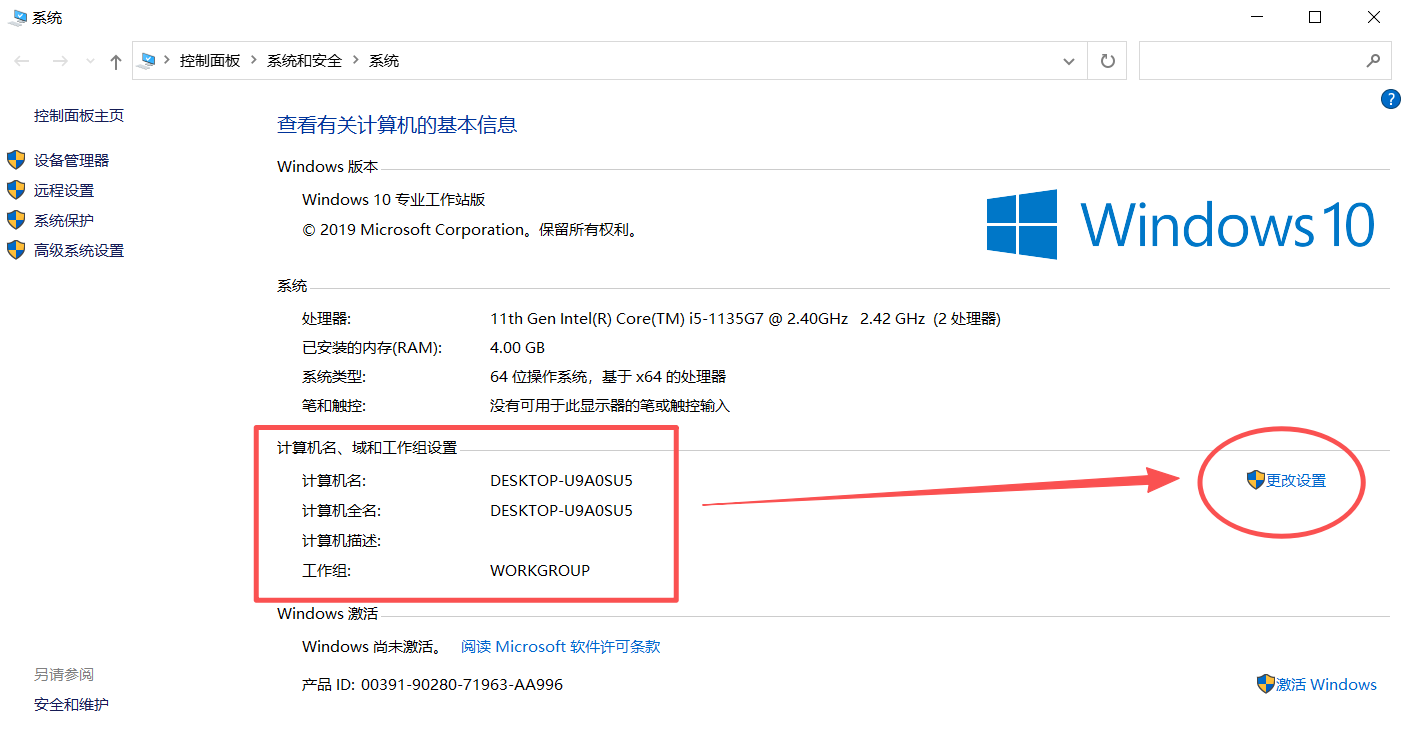 b. 查看计算机名可在“此电脑”——“属性”——“计算机名”中查看,如下:(解决办法:在该页面中点击“更改设置”——“更改”中修改)