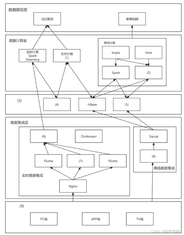 下图给出了某网奥运的大数据架构图,请根据下面的 (a)~ (n) 的相关技术,判断这些技术属于架构图的哪个部分,补充完善下图1的 (1) - (9) 的空白处。