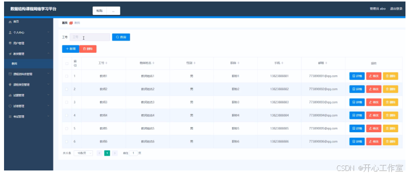 This data structure course network learning platform has administrators, teachers, and users. The administrator functions include personal center, user management, teacher management, course material management, course type management, test question management, test paper management, and test management. Teachers can publish course materials and exam information. The user can view the exam information and take the exam. So it has a certain practicability.
