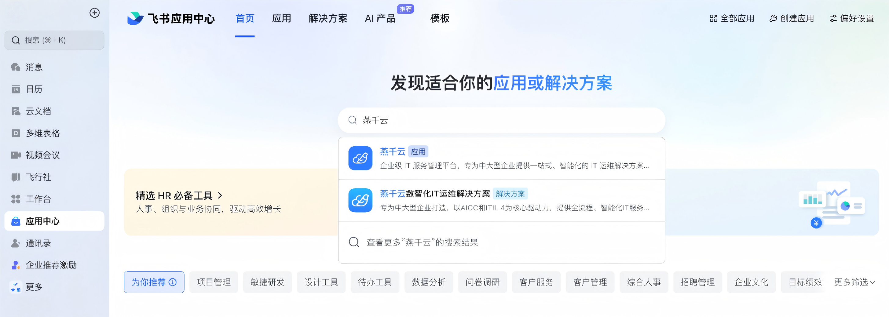 第一步,在飞书应用中心搜索 “燕千云” 并点击进入,全程无需脱离飞书生态;