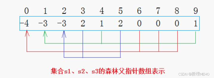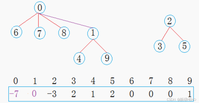 比如:某公司今年校招全国总共招生10人,西安招4人,成都招3人,武汉招3人,10个人来自不同的学校,起先互不相识,每个学生都是一个独立的小团体,现给这些学生进行编号:{0, 1, 2, 3, 4, 5, 6, 7, 8, 9}; 给以下数组用来存储该小集体,数组中的数字代表:该小集体中具有成员的个数。【其中负号表示对应下标的人是“队长”,负数的绝对值代表该队伍有多少个人】