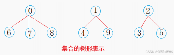 西安学生小分队s1={0,6,7,8},成都学生小分队s2={1,4,9},武汉学生小分队s3={2,3,5}就相互认识了,10个人形成了三个小团体。假设右三个群主0,1,2担任队长,负责大家的出行。