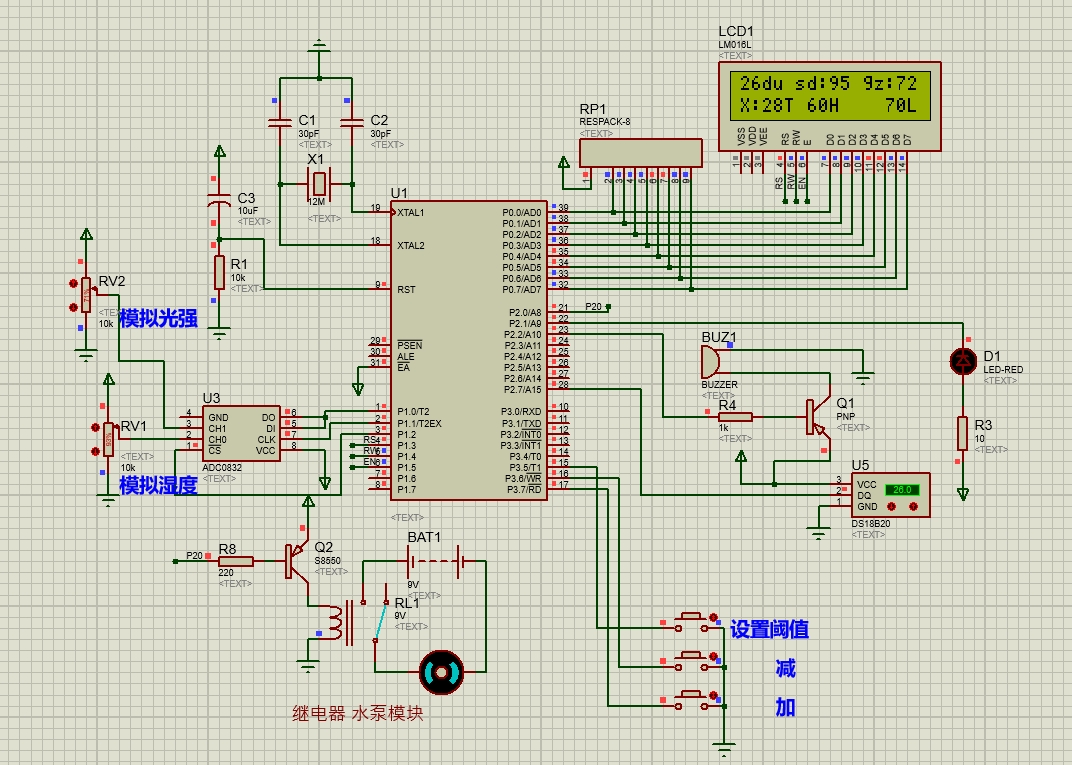 完整教程:【51单片机】【protues仿真】基于51单片机土壤湿度温度光照检测系统