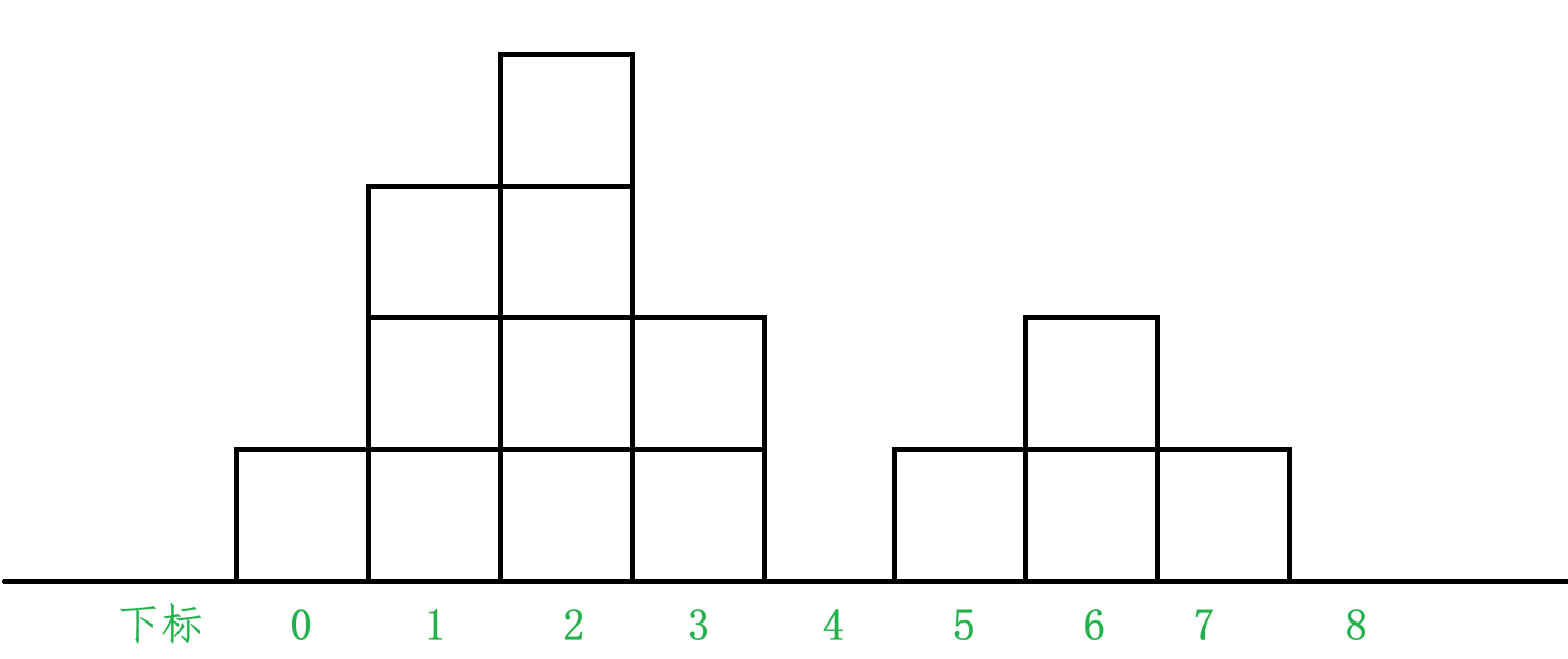 这道题目的题意还是很好理解的,就是给你一个 height 数组,然后这个数组 height[i] 代表的是 i 下标位置柱子的高度,假设天空中下了一场大雨,问你这些柱子能存储多少格子的水量。比如:height = [1, 3, 4, 2, 0, 1, 2, 1, 0],用图来表示就是: