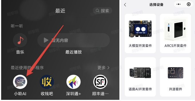 - 打开“小聆AI”小程序,点击添加设备,选择对应硬件按提示操作即可完成绑定进行配置(ESP32的开发板可以选择【开源套件】)