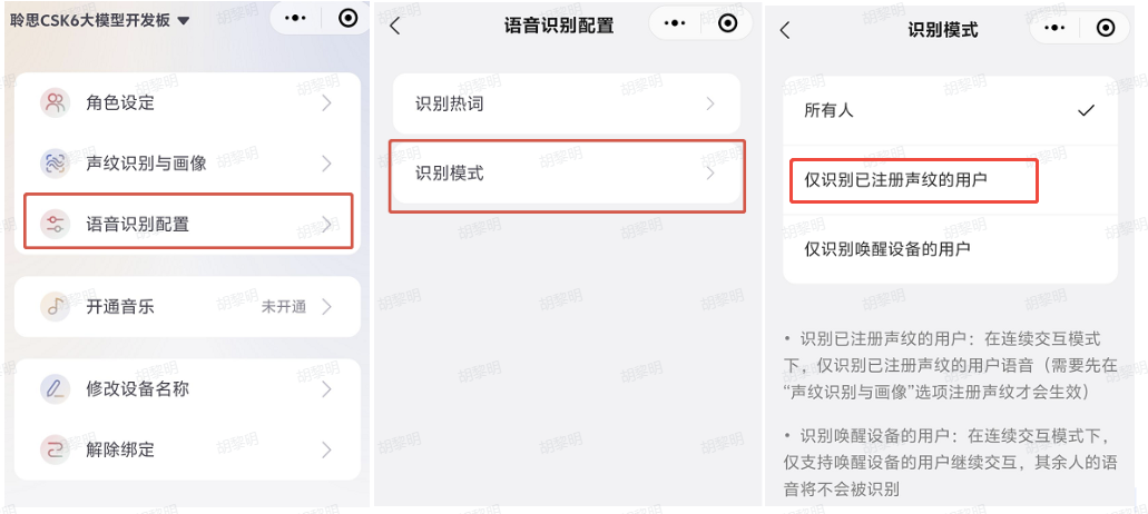 - 绑定成功后,进入【语音识别配置】→【识别模式】→【仅识别已注册声纹的用户】