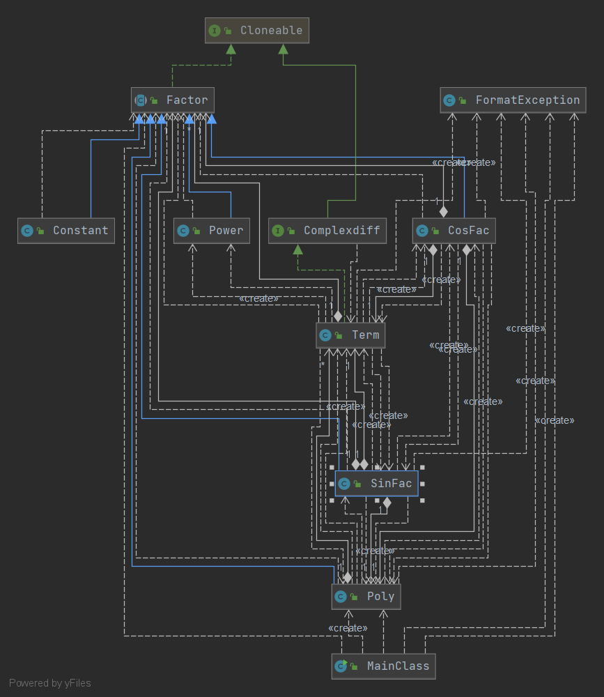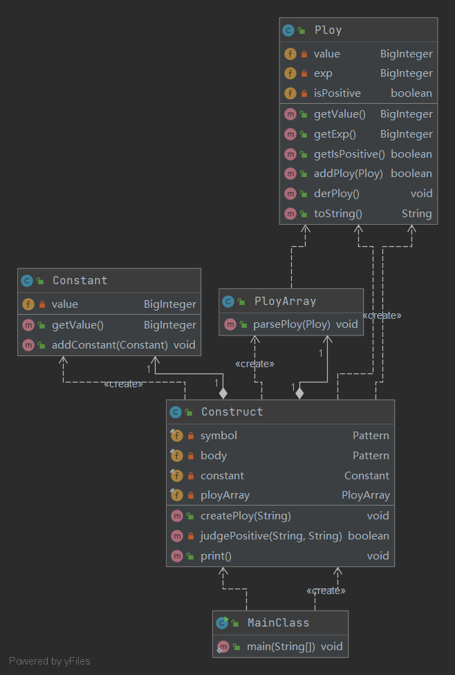 实际上由于常数求导为0,笔者由于想偷懒就只是设置了一个Constant类但并没有将其加入到容器里,第一次作业也没有判WF的情况,所以就直接通过正则表达式匹配字符串(正则表达式放在Construct类中),再将匹配到的幂函数创建一个Ploy类并丢入PloyArray这个自定义容器(基于Hashmap,key为exp)中里进行合并。