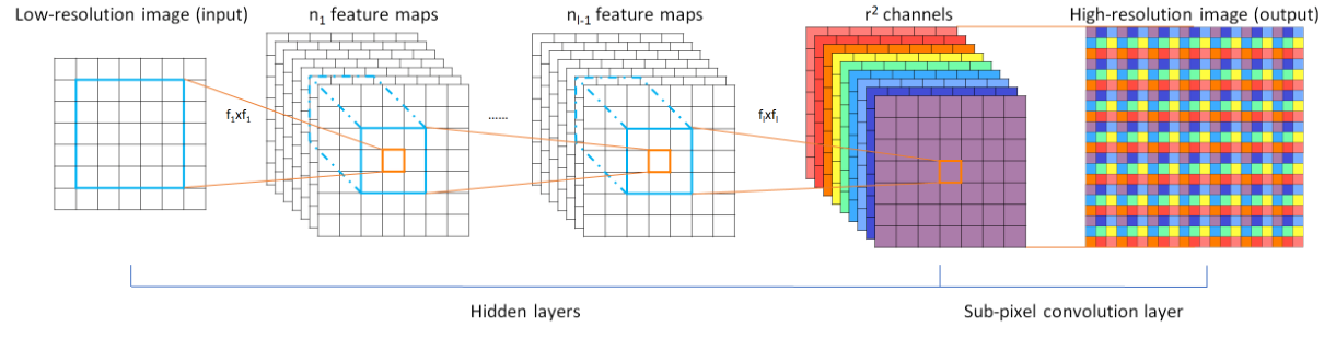 ESPCN的核心概念是亚像素卷积层(sub-pixel convolutional layer)。网络的输入是原始低分辨率图像,通过三个卷积层以后,得到通道数为 r^2 的与输入图像大小一样的特征图像。