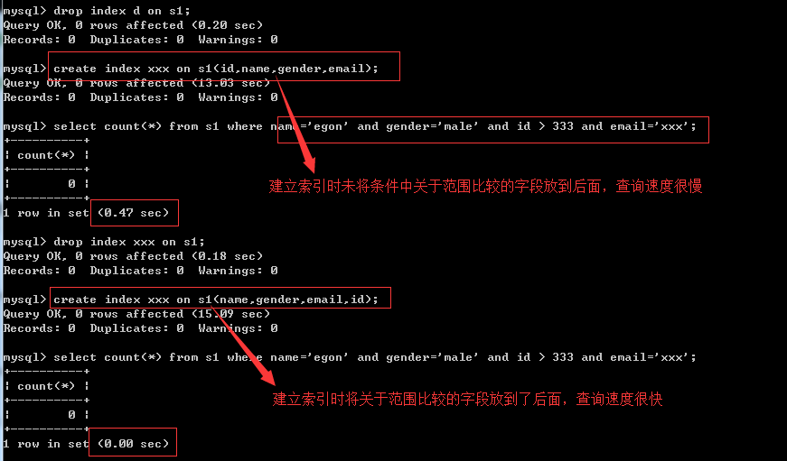 2.索引的最左匹配特性:当b+树的数据项是复合的数据结构,比如(name,age,sex)的时候,b+数是按照从左到右的顺序来建立搜索树的,比如当(张三,20,F)这样的数据来检索的时候,b+树会优先比较name来确定下一步的所搜方向,如果name相同再依次比较age和sex,最后得到检索的数据;但当(20,F)这样的没有name的数据来的时候,b+树就不知道下一步该查哪个节点,因为建立搜索树的时候name就是第一个比较因子,必须要先根据name来搜索才能知道下一步去哪里查询。比如当(张三,F)这样的数据来检索时,b+树可以用name来指定搜索方向,但下一个字段age的缺失,所以只能把名字等于张三的数据都找到,然后再匹配性别是F的数据了, 这个是非常重要的性质,即索引的最左匹配特性。