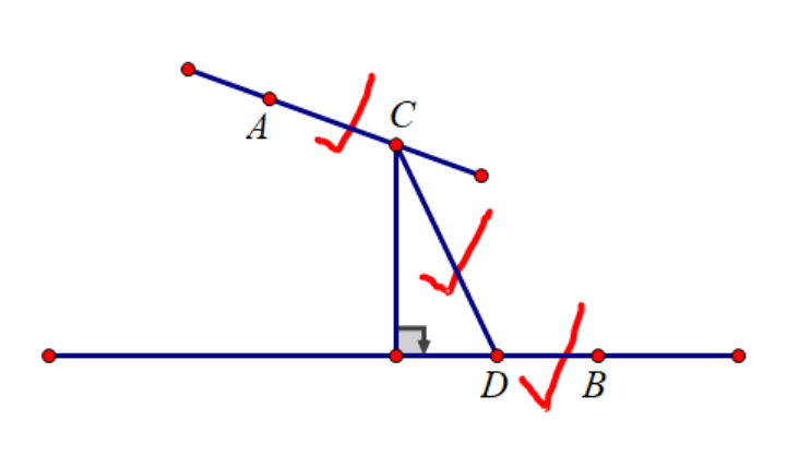 求 \(f(x)=kL-kx+\sqrt{d^2+x^2}\) 的最小值,求导得 \(f'(x)=-k+\dfrac{x}{\sqrt{d^2+x^2}}=0\),解得 \(x=\dfrac{kd}{\sqrt{1-k^2}}\)。但是有可能 \(x>L\),那就只能取 \(x=L\)。再者,有可能 \(D\) 不在 \(AB\) 上,那就再把 \(A,B\) chk 一下。总之就是,要么是 \(x=\dfrac{kd}{\sqrt{1-k^2}}\),要么把 \(K,A,B\) 都 chk 一下就好了。我们惊奇的发现,这个解竟然与 \(L\)(也就是 \(K\) 的位置)无关,只与 \(AB,S\) 有关!(虽然 chk \(K\) 的时候还是要考虑一下的)