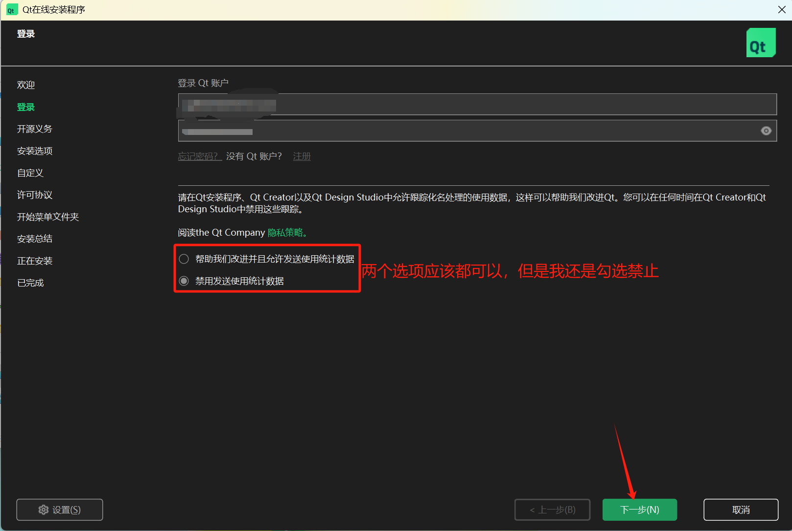 2、输入自己的QT账号密码,勾选:禁用发送使用统计数据(网上找的教程是说两个选项都可以),然后Next