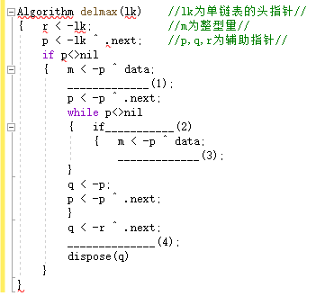5)算法中r变量最终指向数据域最大结点的_______(前趋结点或后继结点)。
