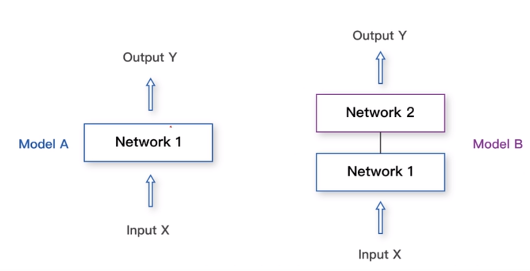 介绍残差块之前,先看下面是一个简单的模型介绍,右边模型相较于左边多一个网络,正常来说B模型比A模型的效果好,如果B的网络为恒等因式,那么A模型的解其实是B模型解的子空间
