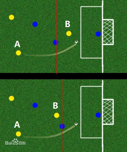 概述图上球员A传球瞬间,球员B处于越位位置,