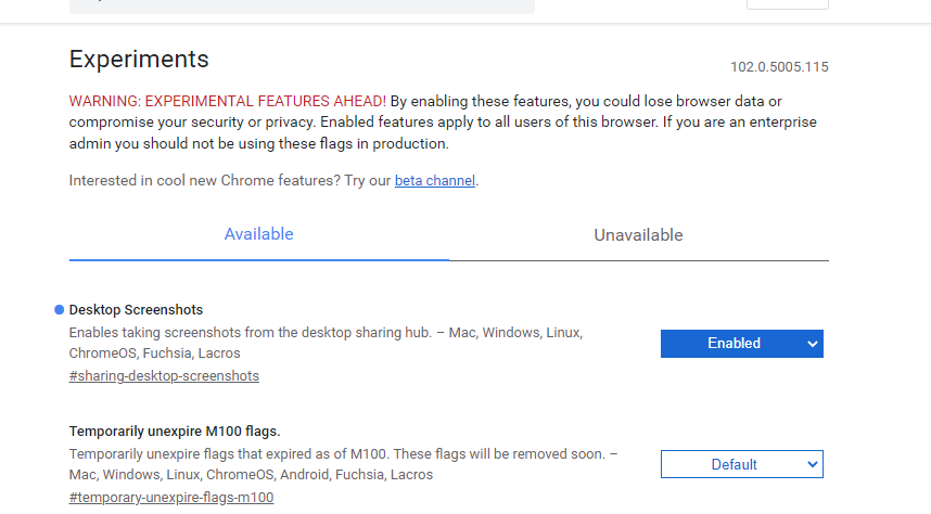 步骤2. 直接搜索「Desktop Screenshots」功能,全改为「Enabled」后,按下「Relaunch」后重启谷歌Chrome 浏览器,就会启用内置 Chrome的截图快捷键隐藏功能。