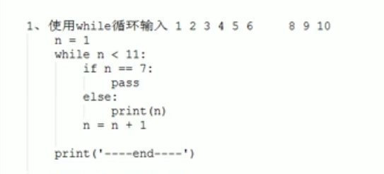 n=1 while n < 10: if n == 7: pass else : print (n) print('----end----')