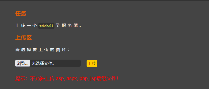 打开第三关,首先尝试上传一句话木马文件,发现提示“不允许上传...后缀文件!”