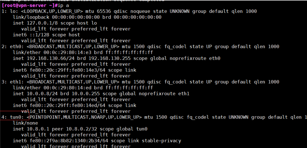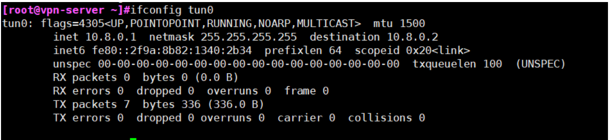 #在服务器开启ip_forward转发功能 [root@vpn-server ~]#echo net.ipv4.ip_forward=1 >> /etc/sysctl.conf [root@vpn-server ~]#sysctl -p net.ipv4.ip_forward = 1 #添加SNAT规则 [root@vpn-server ~]#echo 'iptables -t nat -A POSTROUTING -s 10.8.0.0/24 -j MASQUERADE' >> /etc/rc.d/rc.local [root@centos8 3]#chmod +x /etc/rc.d/rc.local [root@centos8 3]#/etc/rc.d/rc.local [root@vpn-server ~]#iptables -vnL -t nat Chain PREROUTING (policy ACCEPT 215 packets, 27276 bytes) pkts bytes target prot opt in out source destination Chain INPUT (policy ACCEPT 1 packets, 52 bytes) pkts bytes target prot opt in out source destination Chain POSTROUTING (policy ACCEPT 104 packets, 16846 bytes) pkts bytes target prot opt in out source destination 0 0 MASQUERADE all -- * * 10.8.0.0/24 0.0.0.0/0 Chain OUTPUT (policy ACCEPT 104 packets, 16846 bytes) pkts bytes target prot opt in out source destination