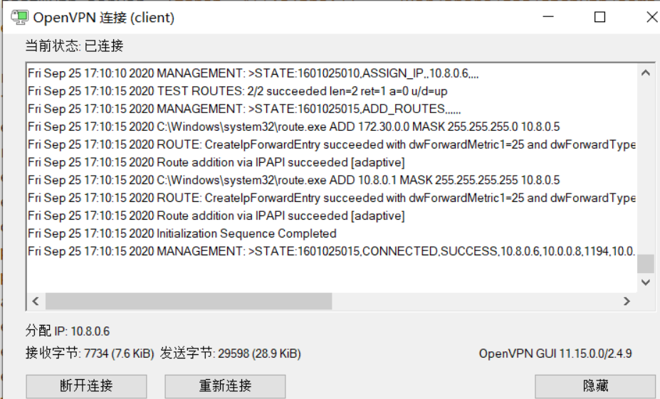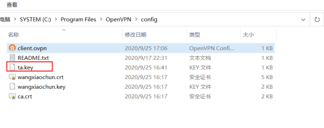 #在服务器打包证书并下载发送给windows客户端 [root@centos8 ~]#cd /etc/openvpn/client/wangxiaochun/ [root@centos8 wangxiaochun]#ll total 20 -rw------- 1 root root 1204 Sep 25 16:17 ca.crt -rw-r--r-- 1 root root 238 Sep 25 16:33 client.ovpn -rw------- 1 root root 4506 Sep 25 16:17 wangxiaochun.crt -rw------- 1 root root 1704 Sep 25 16:17 wangxiaochun.key #下载上面4个文件传至C:\Program Files\OpenVPN\config openvpn客户端安装目