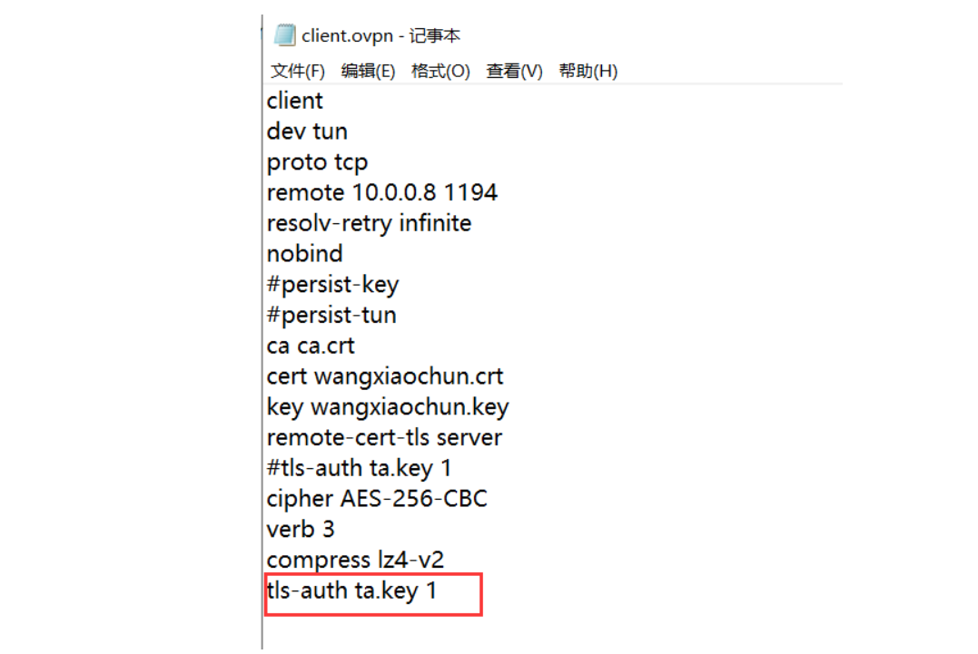 #生成客户端配置文件,文件名后缀必须为.ovpn [root@vpn-server ~]#grep '^[[:alpha:]].*' /usr/share/doc/openvpn/sample/sample-config-files/client.conf client dev tun proto udp remote my-server-1 1194 resolv-retry infinite nobind persist-key persist-tun ca ca.crt cert client.crt key client.key remote-cert-tls server tls-auth ta.key 1 cipher AES-256-CBC verb 3 [root@vpn-server ~]#grep '^[[:alpha:]].*' /usr/share/doc/openvpn/sample/sample-config-files/client.conf > /etc/openvpn/client/wangxiaochun/client.ovpn [root@vpn-server ~]#cat /etc/openvpn/client/wangxiaochun/client.ovpn client dev tun proto tcp remote 10.0.0.8 1194 resolv-retry infinite nobind #persist-key #persist-tun ca ca.crt cert wangxiaochun.crt key wangxiaochun.key remote-cert-tls server #tls-auth ta.key 1 cipher AES-256-CBC verb 3 compress lz4-v2