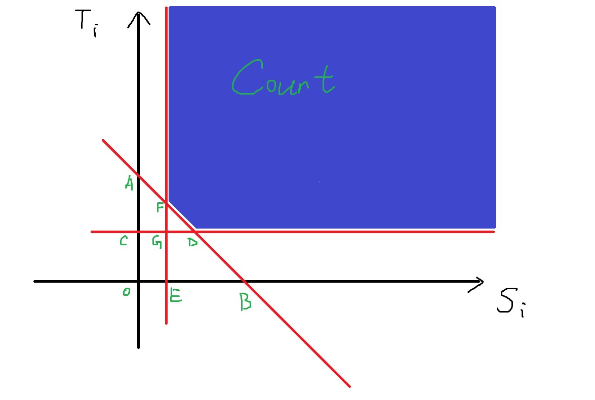 要求蓝色区域,可以用矩形区域减去 \(\triangle DGF\),要求 \(\triangle DGF\),可以用 \(\triangle DGF = \triangle ACD + \triangle BEF + \square OCGE - \triangle OAB\),分别等价于求一下五类点的数量:
