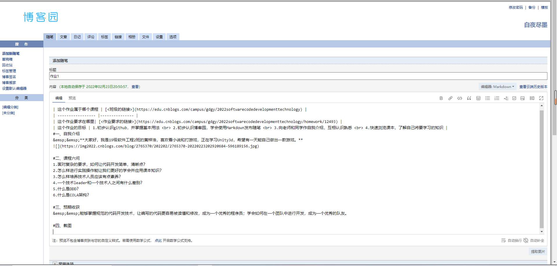 | 这个作业的目标 | 1.初步认识github,并掌握基本用法 2.初步认识博客园,学会使用Markdown发布随笔 3.向老师和同学作自我介绍,互相认识熟悉 4.快速浏览课本,了解自己将要学习的知识 |