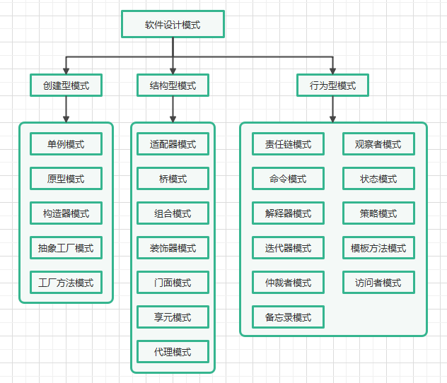 | 责任链模式 | 将客户端请求处理的不同职责对象组成请求处理链,客户端只需要把请求交付到该链上,后续处理交给链上的对象。 |