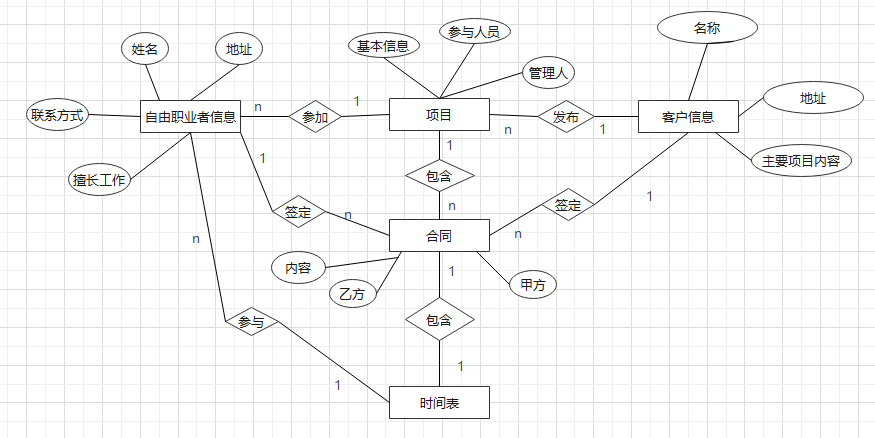 | 4 | 合同表 | 合同编号 | 自由职业者编号,普通客户编号 | 合同编号,合同时间,合同有效期,合同内容,客户编号,自由职业者编号 |