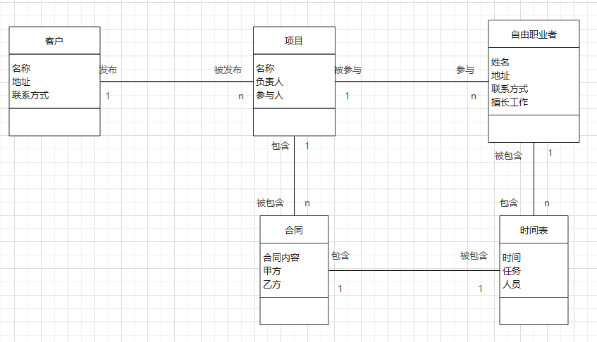 | 3 | 项目表 | 项目编号 | 自由职业者编号,普通客户编号 | 编号,项目内容,项目时间,项目分类,客户编号,自由职业者编号 |