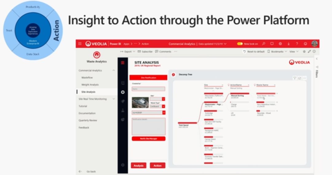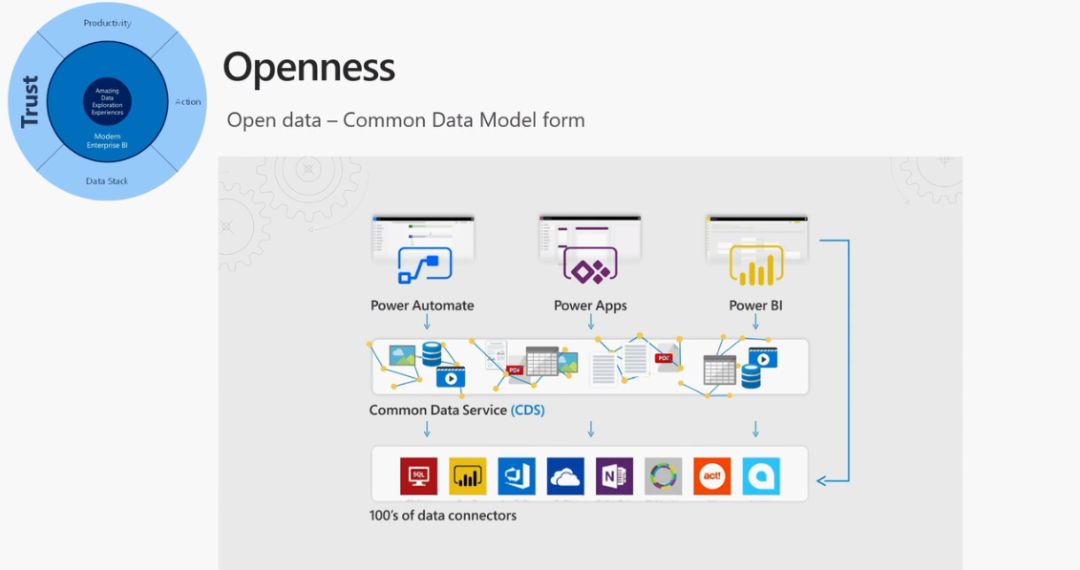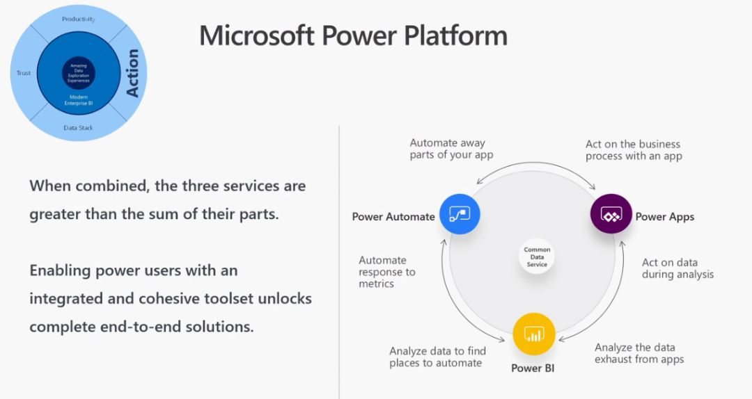 大家都知道分析的目的是为了驱动业务行动,并运转起来,微软提供了一整套机制,叫 Power Platform,Power BI 作为重要一环与 Power Apps 和 Power Automate 形成了完美结合,如下: