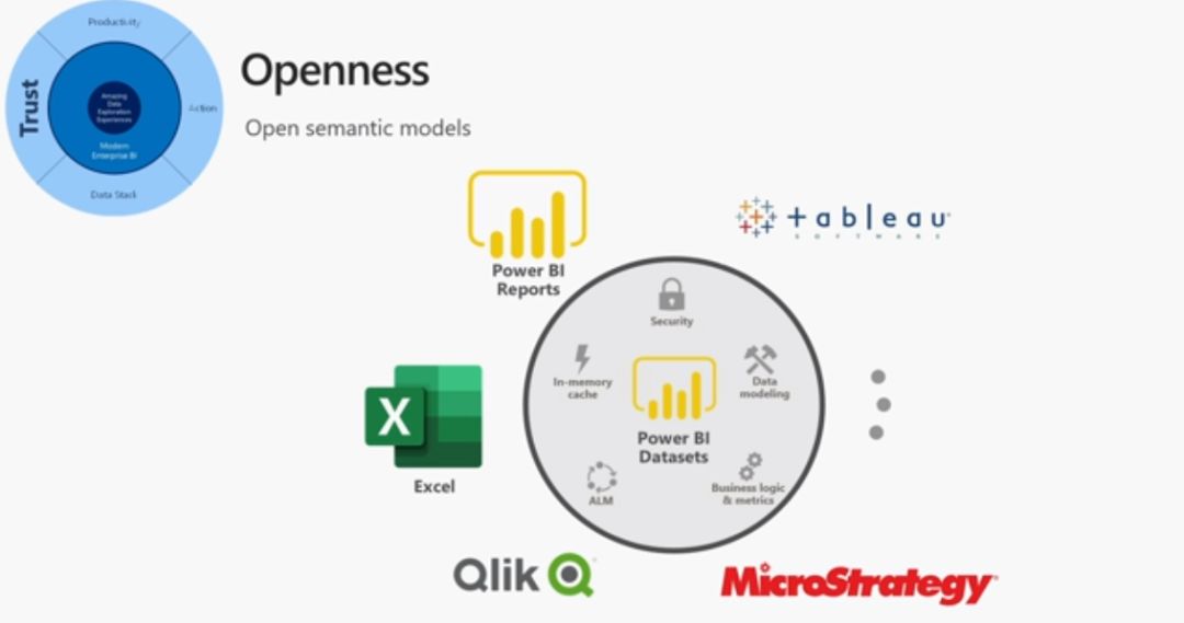 从开放来说,Power BI 提供了公共语义层,与其他可视化工具也可以衔接,如下: