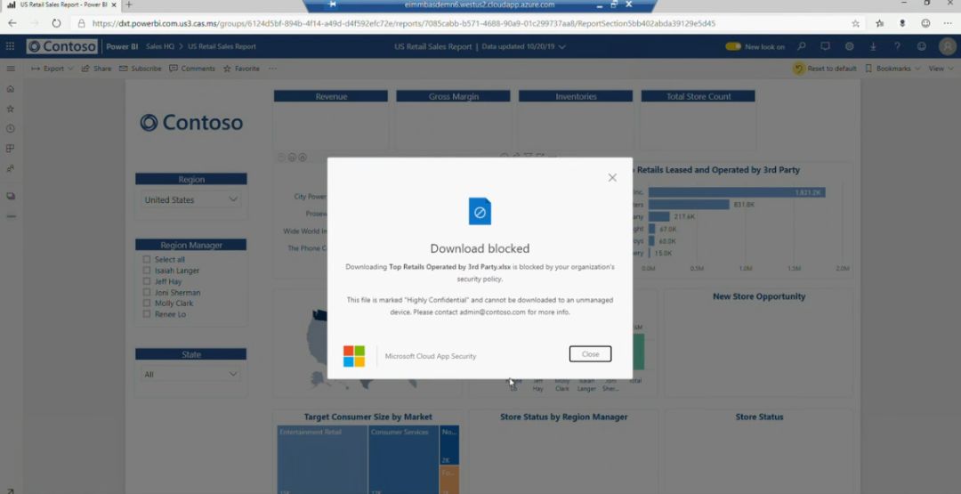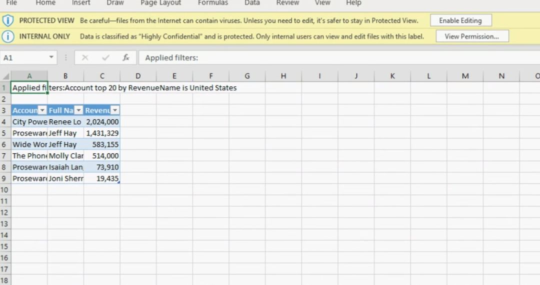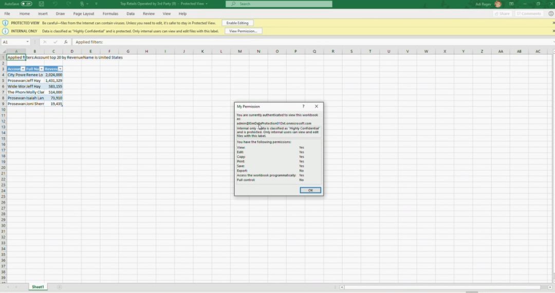 即使数据从 Power BI 导出后,还是在得到安全性控制,如下: