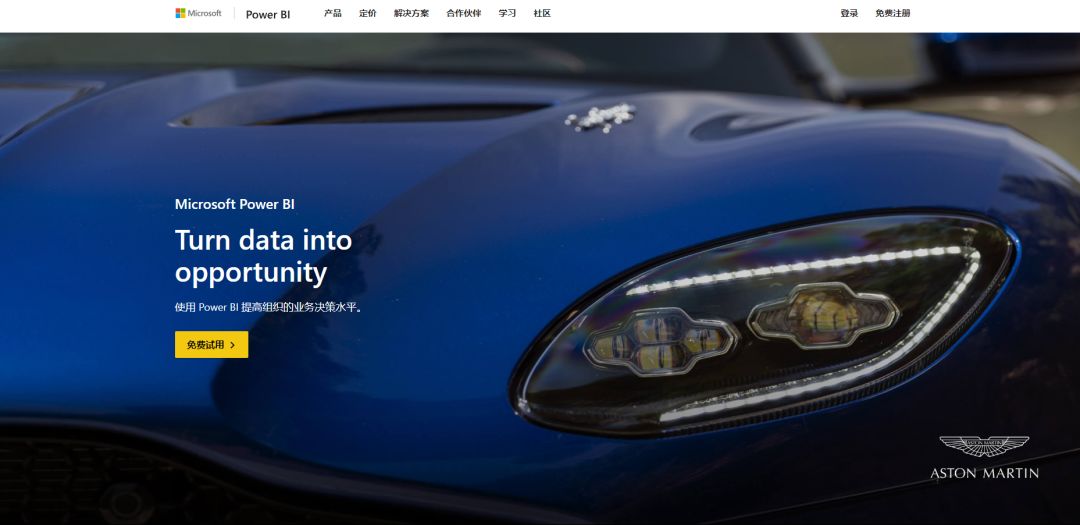 PowerBI 迎来众多更新。首先就是官方网站的变化。一个大大的阿斯顿马丁睁着大灯眼睛,让你知道 Power BI 的定位。这次改版后,官方网站是历史上最大气的,而且几个字非常清晰的表明:将数据转为商机。一句道出 Power BI 的终极使命。