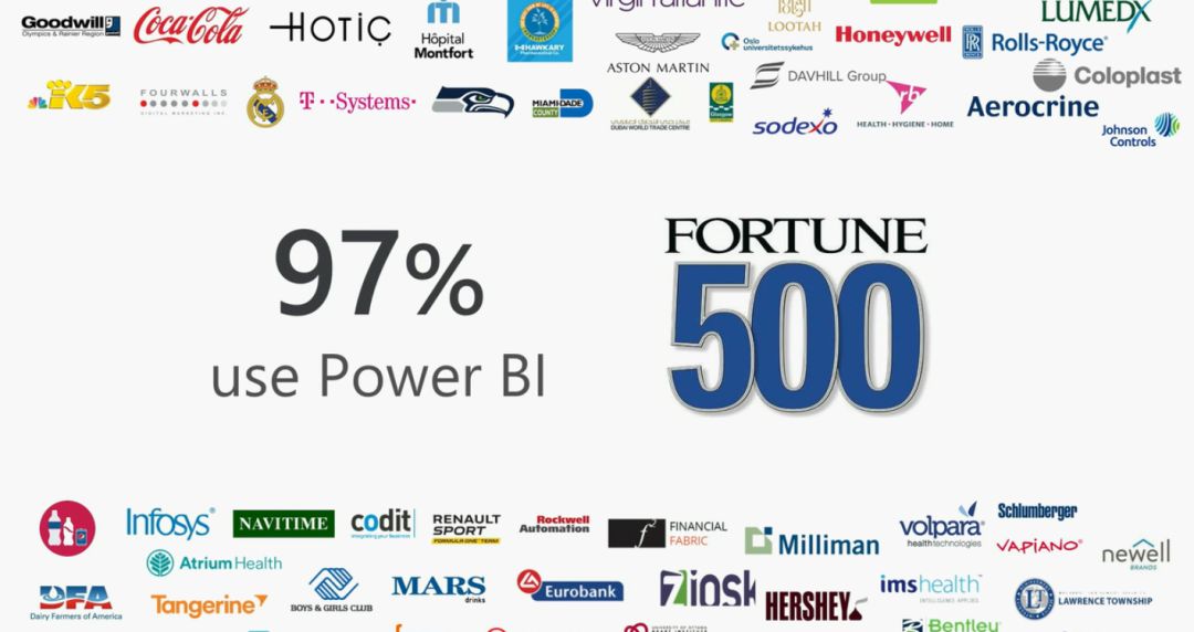 目前有 97% 的世界500强企业正在使用 PowerBI。相比于此前的 95%,又增加了 2%,估计只剩几家竞争对手没有用了吧,什么?竞争对手也在用,用来研究怎么应对,可以可以的~~~