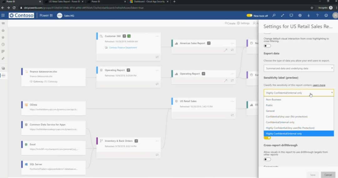 现在 Power BI 将在所有环节都可以使用敏感性标签以标明或控制数据应该怎样被合规且可控下使用。如下: