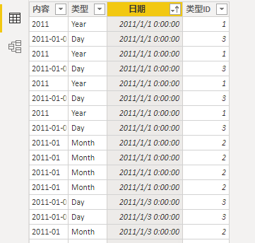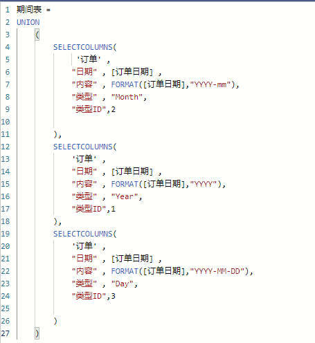 第一步是在模型中创建一个表,该表将用于控制动态轴,需要包括切片器使用的列。在示例中,控制表称为“期间表”。期间表的数据可以在Power BI的外部生成,但本次案例通过DAX来创建。以下DAX代码通过使用UNION函数将不同类型的期间汇总到一个“期间表”中。