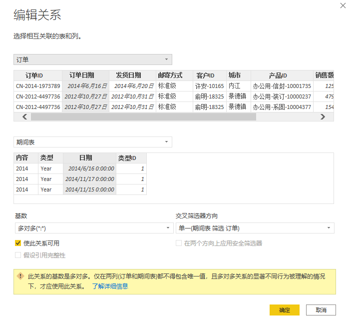 下图显示了所使用关系的详细信息。关系的基数设置为多对多(*:*),并且交叉筛选器方向直接设置为单一(期间表筛选订单)。忽略关于多对多的警告。