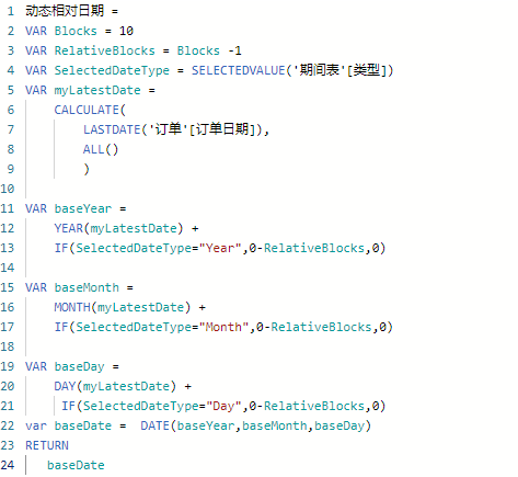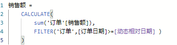 通过在计算中使用此度量为过滤器,以限制每个计算返回的时间。在有些情况下,这可能会加快你的报告速度。例如下方这个计算度量,CALCULATE语句中的FILTER函数传递一条过滤,只使用在[动态相对日期]度量中计算出的值之后的日期。